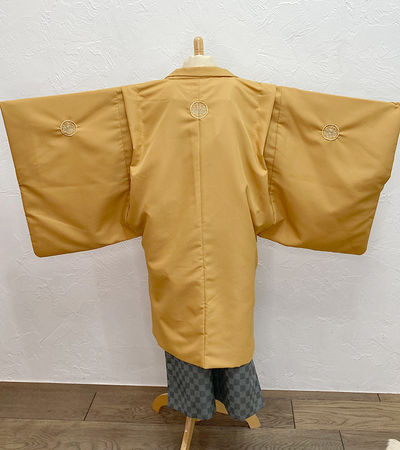 クリーム地着物と羽織(五つ紋)とグレー市松袴