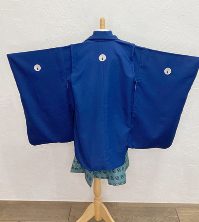 青地の着物と羽織に水色地知恵の輪袴